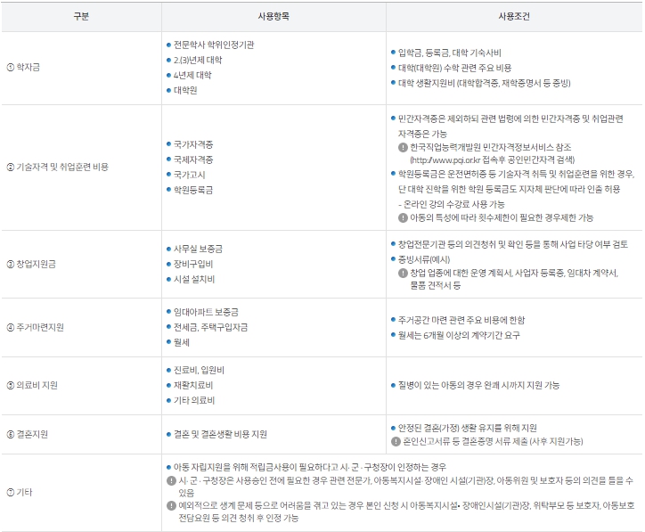 학자금, 기술자격 및 취업훈련비용, 창업지원금, 주거마련 지원 등 자립을 위한 용도에 한하여 사용 가능